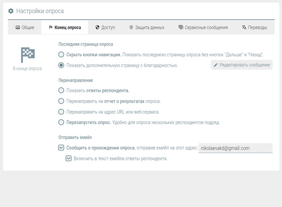 На вкладке «Конец опроса» вы устанавливаете, что происходит, когда респонденты достигают конца опроса или полностью заполняют анкету.