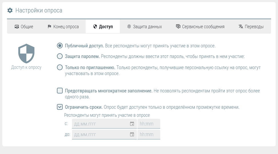 На вкладке «Доступ» вы решаете, кто может принять участие в опросе. Кроме того, вы можете защитить паролем доступ к опросу и установить сроки действия опроса.