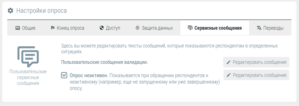 В «Настройках опроса» вы можете настроить его общие характеристики: что люди видят в конце опроса, кто и когда может участвовать в опросе, как обращаться с личной информацией. Здесь вы также можете настроить системные сообщения в анкете.