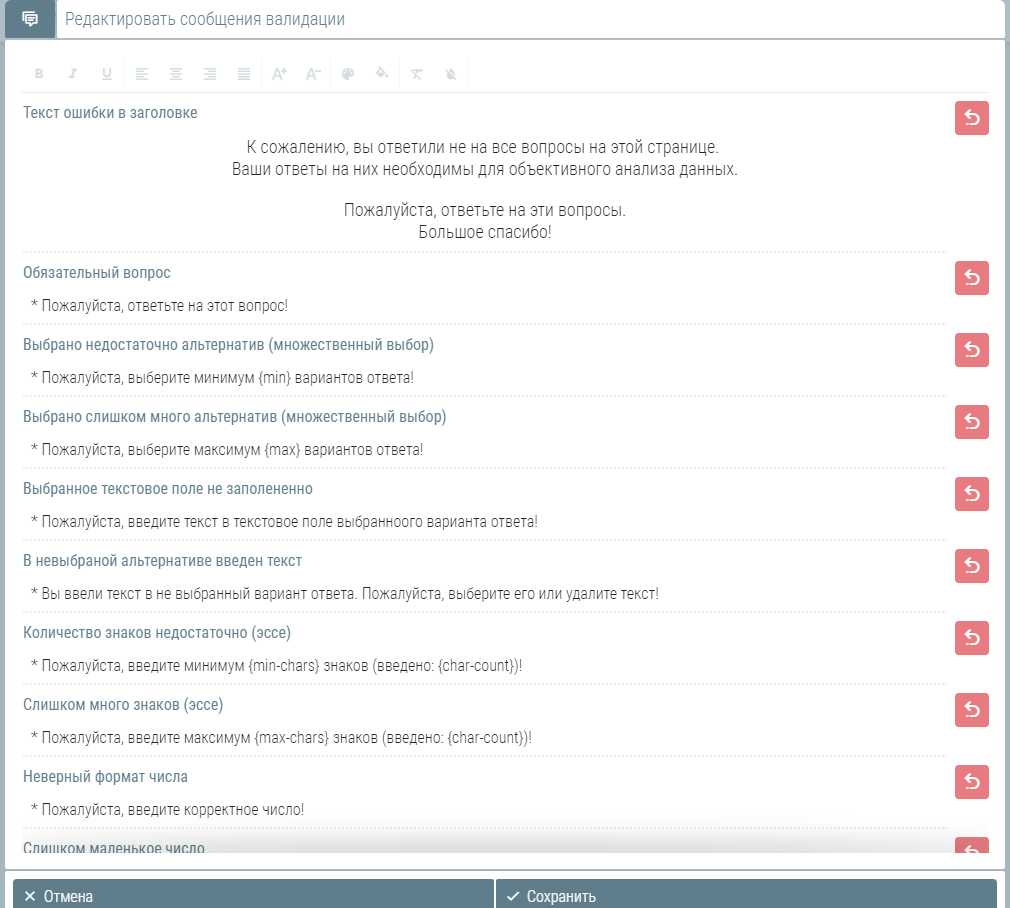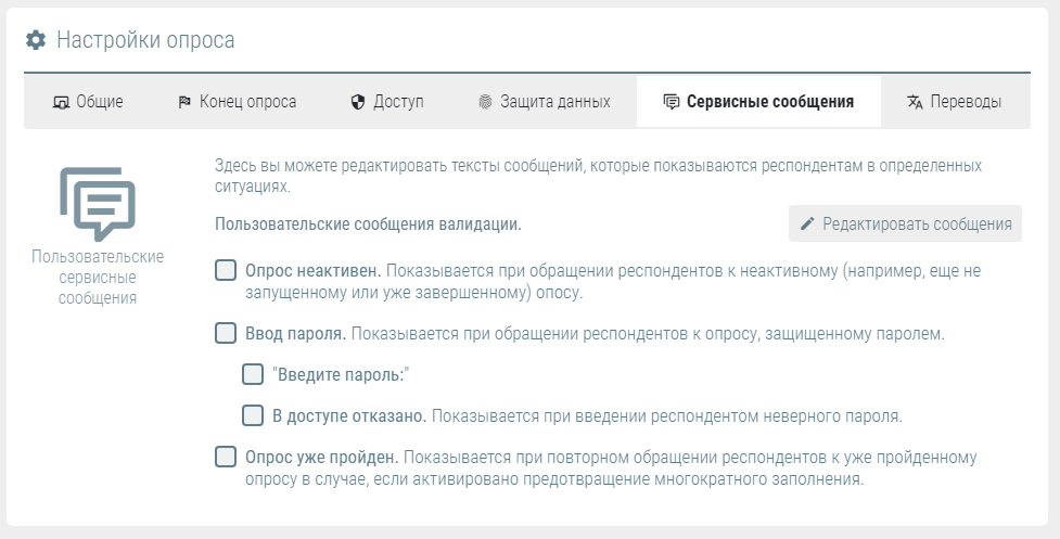 Вы можете настроить текст сервисных сообщений на вкладке «Сервисные сообщения» в «Настройках опроса»: