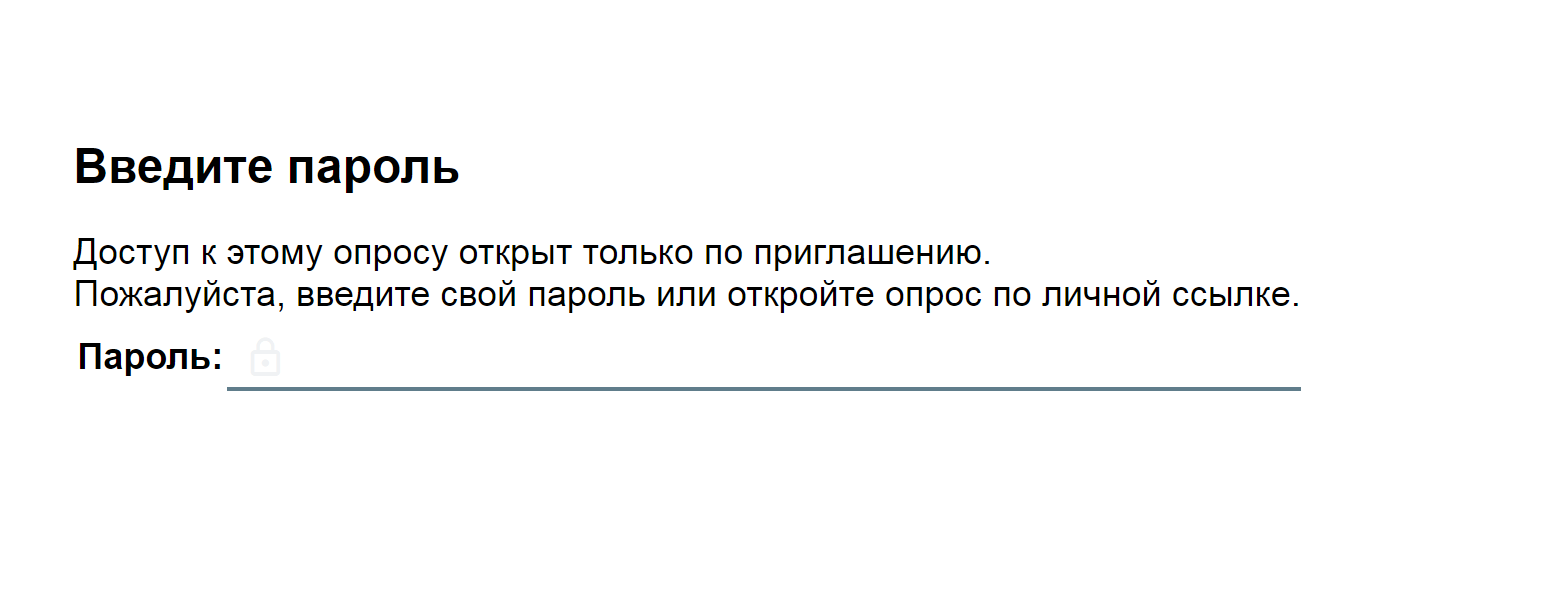Если доступ к опросу ограничен паролем или параметром «только по приглашению», респондентам будет предложено ввести пароль, когда откроется общедоступная ссылка на опрос.